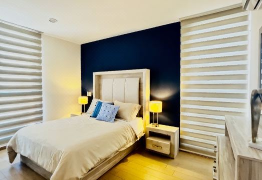 The residential complex features a pool, as well as a privileged view of the city of Guadalajara from the 9th floor and a central location. It has 3 bedrooms, each with 3 queen-size beds, 2 full bathrooms, and a half bathroom for guests. Additionally, it offers two living rooms, one with a plasma TV, a dining room, a fully equipped kitchen, a laundry room with a washer and dryer, 24/7 security with cameras, and 2 covered parking spaces. The access is friendly for people with limited mobility.