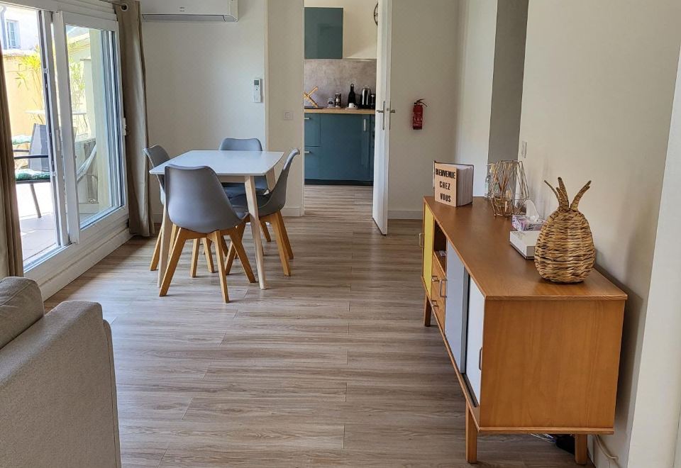 L'appartement très calme et lumineux est un T2 comprenant une grande chambre avec placard, un séjour équipé d'un canapé convertible, une cuisine indépendante, une salle de bain et toilettes séparés. Tout le confort moderne est présent, du lave-vaisselle à la climatisation.