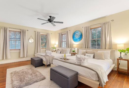 Explore the second floor's open hallway leading to a spacious bedroom with two large beds, ideal for couples, friends, or a sibling sleepover. Climb the second wooden stairs to the third floor, where two bedrooms are connected by a hall shower, bathroom, and vanities—a perfect setup for getting ready before experiencing all Charleston has to offer.