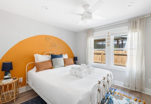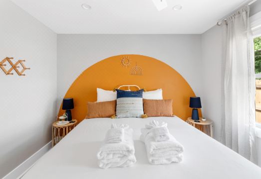 Step inside and be enveloped by the warm embrace of Green Haven, where mid-century modern charm meets vibrant splashes of color. The living area seamlessly flows into a fully-equipped kitchen, promising culinary adventures galore. Dive into your favorite shows on the expansive Smart TV, complete with the Peacock TV app for endless entertainment possibilities.