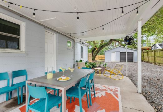 But the true magic awaits outdoors! Step onto the inviting covered patio adorned with twinkling café lights, an eight-person dining table, and a cozy nook for two. And don't miss out on the outdoor shower nestled beneath a majestic 100-year-old oak tree—an idyllic indulgence after a day at the beach or exploring the sights. Green Haven epitomizes relaxed living intertwined with unparalleled style! ?