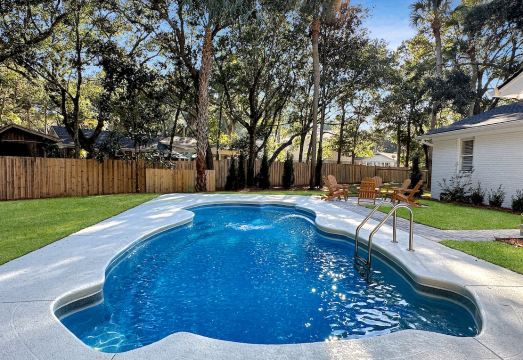 The heart of the home, the fully equipped kitchen, invites culinary adventures with state-of-the-art appliances and a seamless flow to your private patio. Slide open the glass doors to reveal a pool oasis surrounded by lush tropical landscaping – your own slice of paradise for soaking up the South Carolina sunshine or enjoying intimate gatherings under the stars.