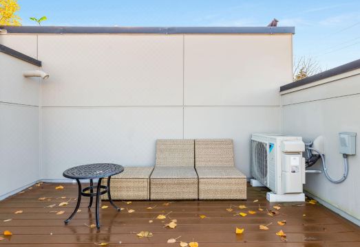 ? Rooftop patio with comfortable outdoor furniture and charcoal BBQ grill.
