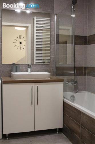 这家空调公寓配有2间卧室、起居室、带冰箱和电热水壶的设施齐全的厨房以及1间带淋浴设施和吹风机的浴室。这家公寓还配备平板电视、休息区、洗衣机以及1间带浴缸的浴室。