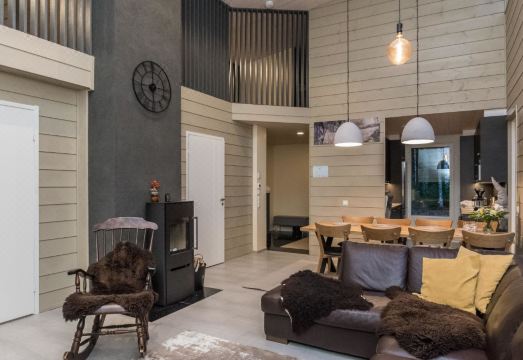 Wooden villa 2023, 160 m2 spacious living room, kitchen, two bedrooms, both with double beds. Upstairs bedroom with double bed, loft with two sleeping alcoves (no curtains) with two beds each and a toilet.