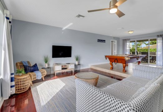 Kick off your shoes and breathe deep - you’re on vacation in one of the most beautiful parts of the country, Marco Island, Florida. Settle into the comfortable patterned couch and take it all in. Relax and find your favorite streaming channels on the large Smart TV. The decor is beach-inspired yet modern and streamlined, with natural fiber accents and soothing blues that give relaxing vibes from the moment you enter the home. This room is the ultimate gathering spot, whether for watching the big game or playing your own game of Pictionary after dinner.