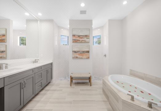 When you first arrive, the soft rustling of palm fronds in the front garden sets the tone for total relaxation—something you’ll experience throughout your stay. The first floor features a luxurious master suite with a king bed, television, an en suite bathroom with his-and-her sinks, a luxuriating bathtub, a shower, and direct lanai access. A second bedroom on this level also comes with a king bed and lanai access, offering a peaceful retreat for guests. An additional full bathroom on this floor ensures convenience for all.