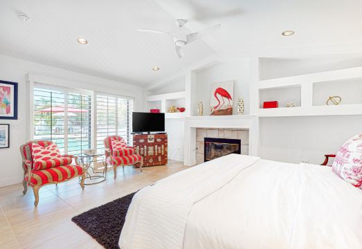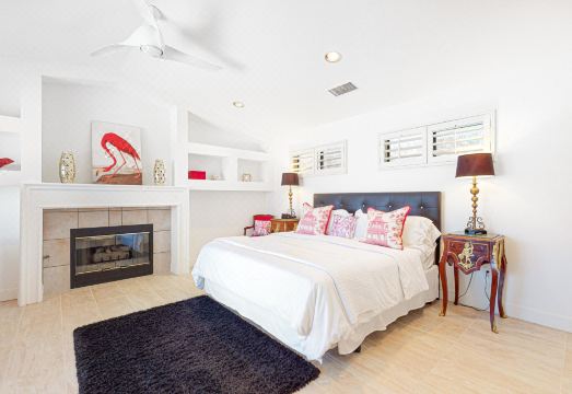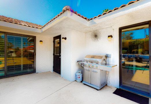 Professionally decorated with bold textiles, vibrant colors and patterns, and modern works of art throughout, this four-bedroom home brings both style and comfort to one of the desert's finest locations. The expansive backyard is the heart of this property, featuring a saltwater pool, a spillover spa, two outdoor eating areas with ample seating, a gas grill, and a firepit to use in the evenings. Every detail has been thought of, from the outdoor TV to the umbrellas that shade portions of the pool. Inside, you can gather after a day of activity to watch TV by the fireplace in the great room. As for the bedrooms, you'll have your choice of four king rooms, each with a TV and a DVD player; two of the bedrooms are master suites at either end of the house.