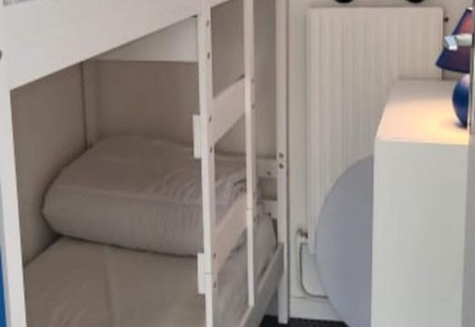 The apartment includes a fully equipped kitchen with a 4-burner gas hob, microwave, fridge, dishwasher, washing machine, Nespresso coffee maker, toaster, and kettle. It also has a cabin with two 90 cm bunk beds, and a bathroom with a shower and toilet. Sheets and towels can be provided upon request for €20. Enjoy beautiful sunsets, green spaces, and views of Pink Flamingos flying over the Camargue waters during your stay. Houses & Villas for 3 People