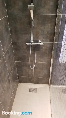 这家空调公寓配有1间卧室、起居室、带冰箱和咖啡机的设施齐全的厨房以及1间带淋浴设施和吹风机的浴室。这家公寓也配备休息区和1间浴室。