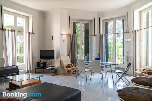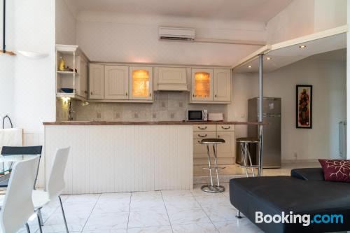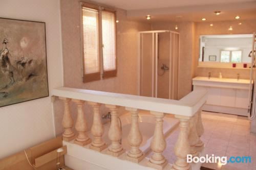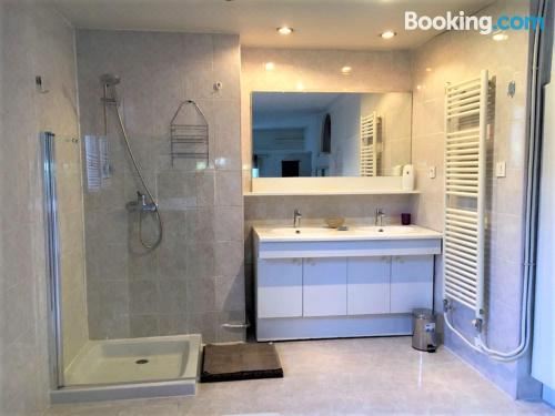 这家空调公寓配有2间卧室、起居室、带冰箱和咖啡机的设施齐全的厨房以及2间带淋浴设施和热水浴池的浴室。2间浴室配有浴缸,也配备免费洗浴用品,提供毛巾和床上用品。