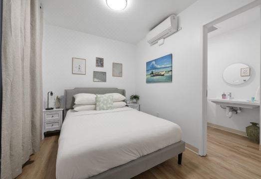 Our cozy 1-bedroom, 1-bathroom unit provides a comfortable living room with a sofa for a relaxing atmosphere. The fully equipped kitchen ensures your culinary needs are met. The bedroom features a queen-sized bed for a peaceful night's rest. A chic and clean bathroom comes with a shower and fresh towels are provided.