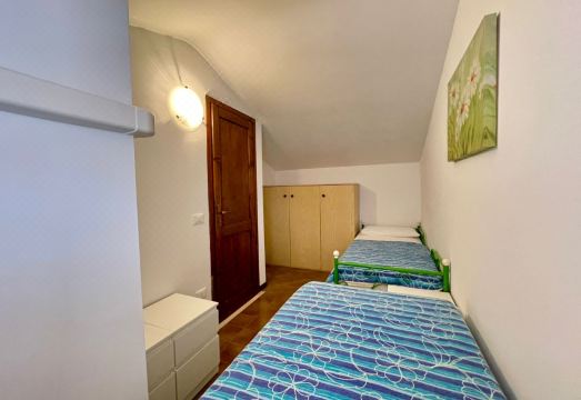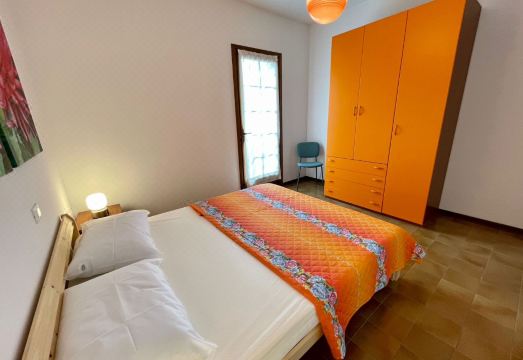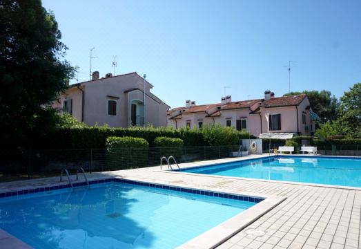 Two-storey terraced house located in a quiet residence with a shared garden and swimming pool. It can comfortably accommodate up to six guests. The ground floor consists of a spacious living room, a fully equipped kitchen, a dining room, a lovely patio, and a service bathroom. The first floor is composed of two double bedrooms, a bedroom with two single beds, and a complete bathroom with shower (curtains). One uncovered parking space is included. Beach distance 550mt. A/C is available at an additional cost (check below).*No pets allowed.°Swimming pools are open seasonally (mid June/early September): exact dates may vary due to weather or maintenance.°Photos are generic and representative of the accommodation type (furniture, décor and colors may vary)