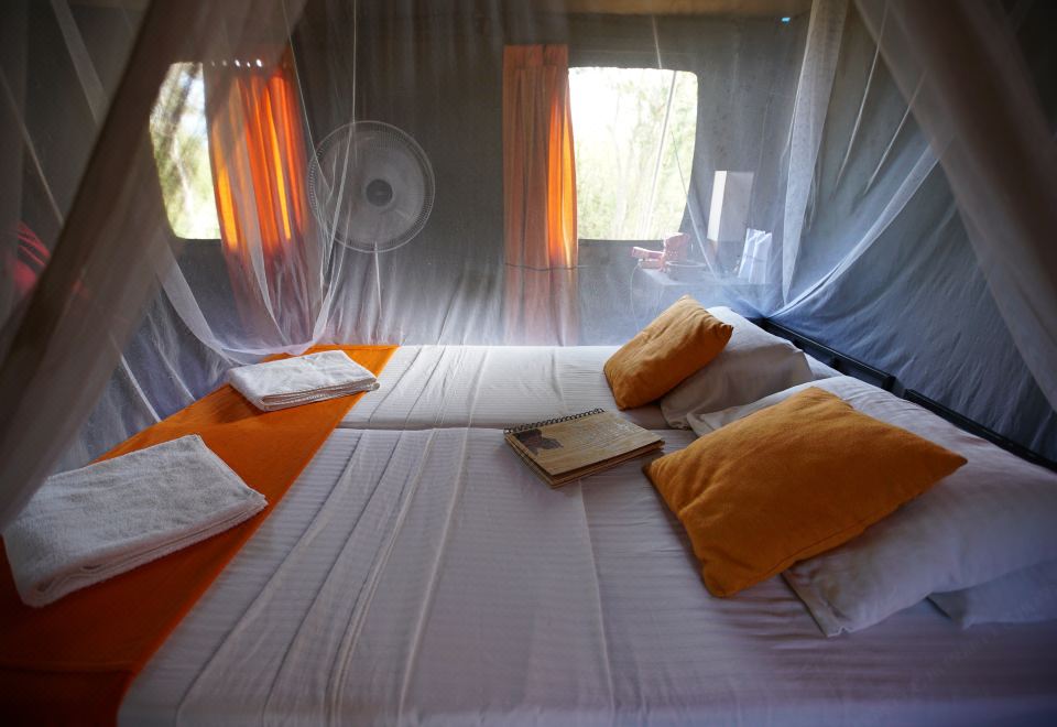 每个帐篷均铺有地毯,设有户外起居区、餐桌和休息区。连接浴室配有热水淋浴。帐篷提供遮阳伞和蚊帐。