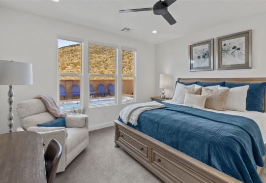 Hillside Retreat at Zion can comfortably sleep 20 guests or up to 24 with the assistance of 4 twin fold up mattresses. The main floor offers a spacious master bedroom complete with an office desk and an ensuite bathroom featuring double sinks, spacious shower, and walk in closet. Adjacent to the main living areas on the main level, there is a queen bedroom with a desk and a shared bathroom. Moving upstairs, you'll discover two king bedrooms with private bathrooms. One of these king bedrooms also has a queen sofa sleeper and a desk. The final bedroom is designed to accommodate large groups with 2 queen over queen bunk beds, a queen-sized sofa sleeper, and two fold out sleeper chairs.