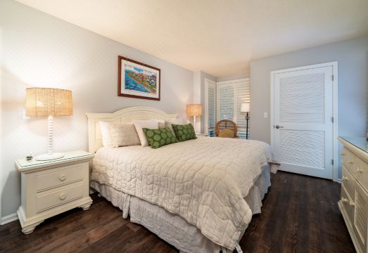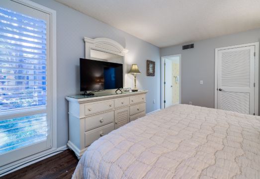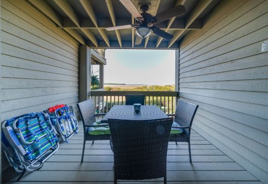 1341 Pelican Watch is a 1st floor villa offering views of fabulous sunsets each night over the water. There are 5 stairs that take you up to the property. Enjoy time with your family while lounging in the living room featuring new comfortable furnishings and a large HDTV. The sofa opens to a queen bed for your extra guests. Dine around the table for four as you share stories from your day on the beach. Step to the covered deck to watch the wildlife in the dunes as the shrimp boats trawl in the river while enjoying drinks around the table. The kitchen has granite tile counters, and updated appliances. There is a stacked washer/dryer in the closet. Off the hall is a full bath with a shower. The master bedroom has a king bed, flat screen TV, and adjoining private bath. The bath has a shower/tub and granite topped vanity.