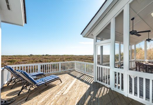 This home is so welcoming; light and bright with 3 Bedrooms, and 3 bathrooms all on one level. As soon as you walk in the door you'll be instantly embraced by the island lifestyle. The open floor plan lends itself to memorable gatherings. You can't help but notice the bright, open space and amazing views of the dunes and ocean beyond. The large great room has vaulted ceiling, transom windows, a fireplace, and new hardwood flooring. Watch your favorite shows or movies on the large HDTV mounted over the fireplace while lounging on the comfy furniture. The kitchen was completely renovated in 2024 and includes custom cabinetry, quartz countertops, and all new stainless steel appliances. The kitchen is well stocked and there is plenty of seating - a sunny breakfast nook seats 4, the main dining area seats up to 8 and there are also 2 counter height bar chairs. Every way you turn you will be excited by the views - sliding patio doors provide easy access to the deck and screened porch where the outdoor living is easy complete with al fresco dining, polywood loveseat and rocker, and two polywood rocking chairs. The open deck includes two chaise lounge chairs. There are two outdoor showers in the carport to rinse of the sand.
