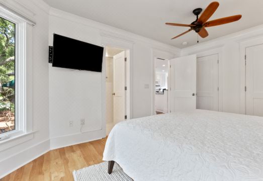 system. The bathroom features a large tiled walk in shower with seat and a vanity with storage. The large master bedroom with king bed features blackout shades for optimal vacation slumber and a TV for bed time viewing. The screened porch is set up to enjoy the sound of the waves and the evening ocean breeze with a spacious couch, armchair and outdoor TV.