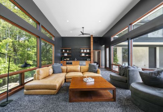 The true ‘charm’ of this property is its outdoor area. It has expansive outdoor entertaining areas, including a covered patio, wood firepit, luxurious pool, and ping-pong table, all surrounded by forest, offering the ultimate in luxury fun.