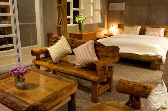 屏东水映自在会馆位于大鹏湾内水映自在民宿主人非常喜欢原木厚实温润的质感,于是慢慢累积收集喜爱的原木,后来结识一位三义老师傅,两人因对原木的热情成为挚友,陈大哥开始对早年收集的原木进行设计,再透过老师傅之手呈现一个个作品,每块原木都有独一无二的表情特性,保留木头天然的坑洞与结眼,没有过度修饰,透过每个作品散发木头的原始魅力,陈大哥决定用这些原木作品建造一个家。